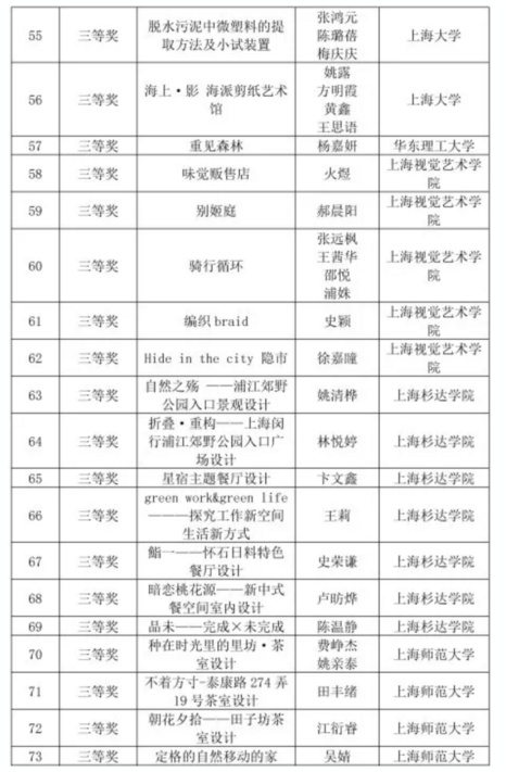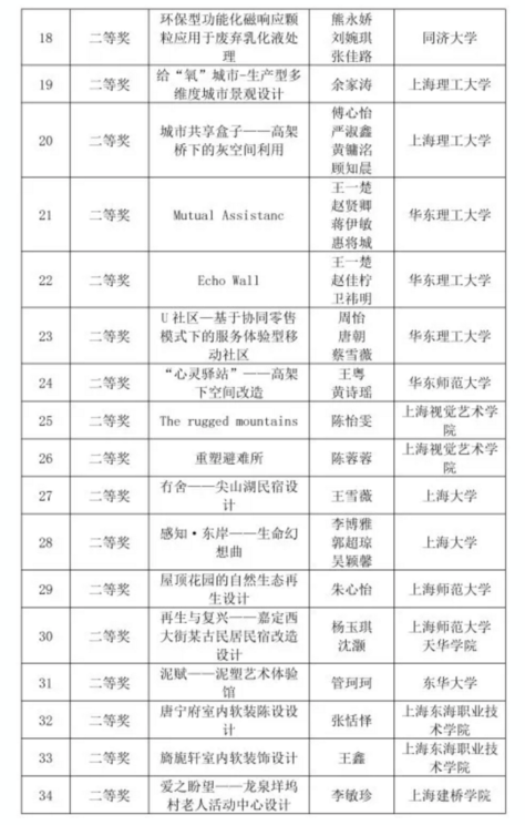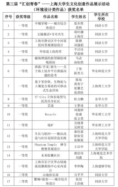 此次活动在为上海市民呈现艺术教育成果、传递文化创意灵感的同时,进一步扩展作品类别、丰富活动内容,推陈出新、实现“新一轮”突破:合力营造氛围、搭载科技平台、接轨国际市场,为开辟教育与产业、创意与创业相辅相成、互动反哺的人才培养与行业发展新路径提供助力支持。经过专家评审委员会认真、细致的评选,现将本届“汇创青春”——上海老员工文化创意作品展示活动(环境设计类作品)获奖名单予以公示。