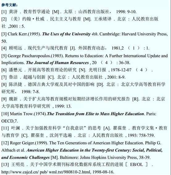 参考文献按在正文中出现的顺序列于文末,请采用 GB7714 - 87 《文后参考文献著录规则》的新规定,其中包括作者、书名 / 文章名、出版社(需要加城市名) / 刊名、出版年份 / 刊发卷期、起止页码。其中:专著 [M] 、期刊文章 [J] 、报纸文章 [N] 、论文集 [C] 、学位论文 [D] 、报告 [R] 、析出文献 [A] 、未说明的文献 [Z] 。